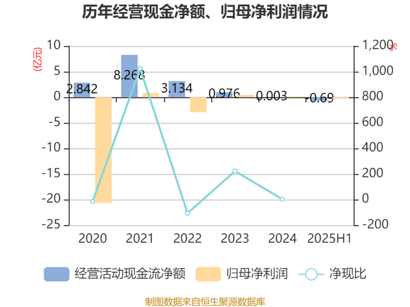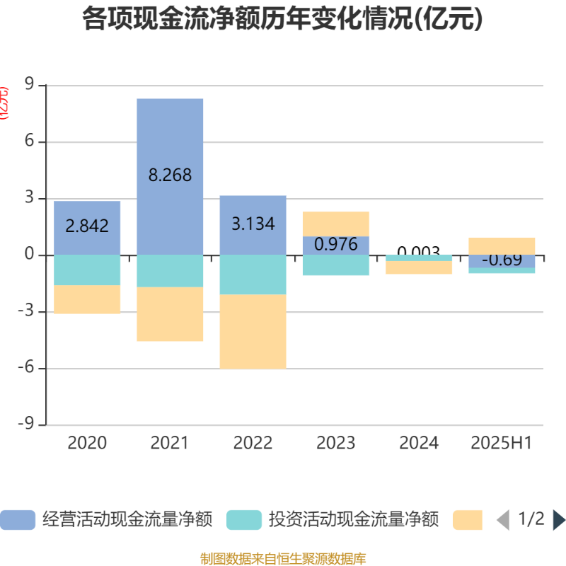 2025年上半年,公司经营活动现金流净额为-6898.67万元,同比减少1.1亿元;筹资活动现金流净额9006.63万元,同比增加1.85亿元;投资活动现金流净额-2967.19万元,上年同期为-6027.75万元。