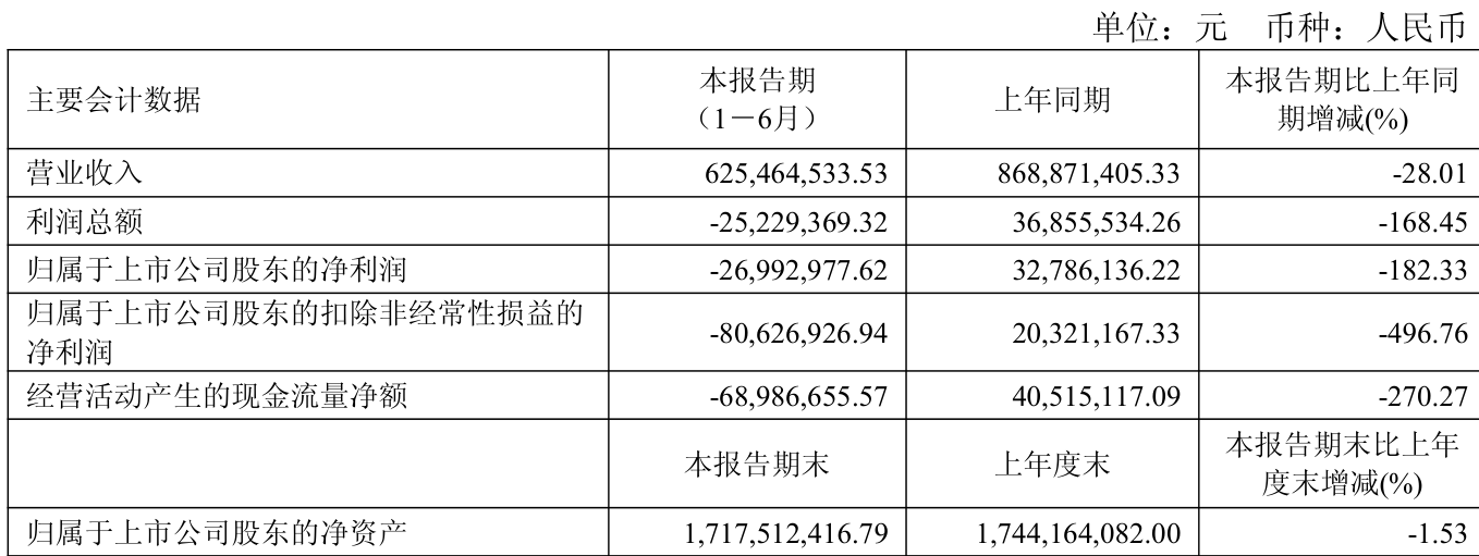 中证智能财讯三峡新材(600293)8月18日披露2025年半年度报告。2025年上半年,公司实现营业总收入6.25亿元,同比下降28.01%;归母净利润亏损2699.3万元,上年同期盈利3278.61万元;扣非净利润亏损8062.69万元,上年同期盈利2032.12万元;经营活动产生的现金流量净额为-6898.67万元,上年同期为4051.51万元;报告期内,三峡新材基本每股收益为-0.02元,加权平均净资产收益率为-1.56%。