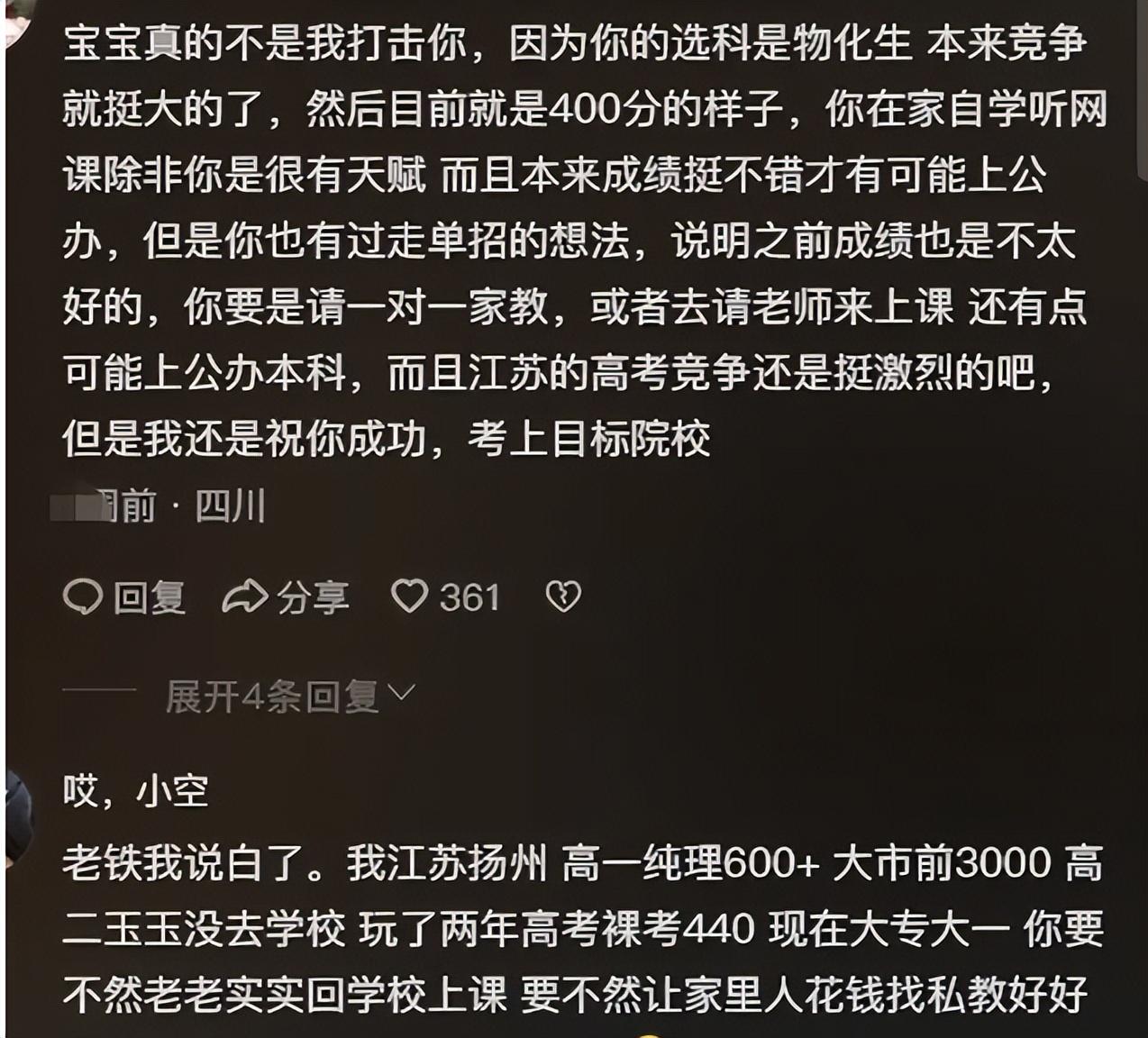 可是,网友们看到这一幕时,却是看法不一。这1.7万点赞背后,其实隐藏着很多不同的声音。绝大多数网友都是来给她打退堂鼓的。他们苦口婆心地劝她看清现实,认为这并不是在打击她,而是希望她能早点认清自己的处境。从专业的角度来看,这个女孩子所选的科目是物理、化学、生物。这三门学科在江苏高考中一直都是竞争极为激烈的选科组合。每年,都有大量成绩优异、天赋异禀的学生选择这三门学科,竞争的激烈程度可想而知。