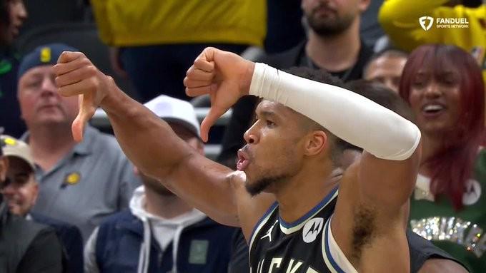 在字母哥完成这记精彩的中投绝杀后,他先是与队友进行了庆祝,随后他向步行者主场球迷先后做出了“噤声”和“双手大拇指向下的喝倒彩”动作。